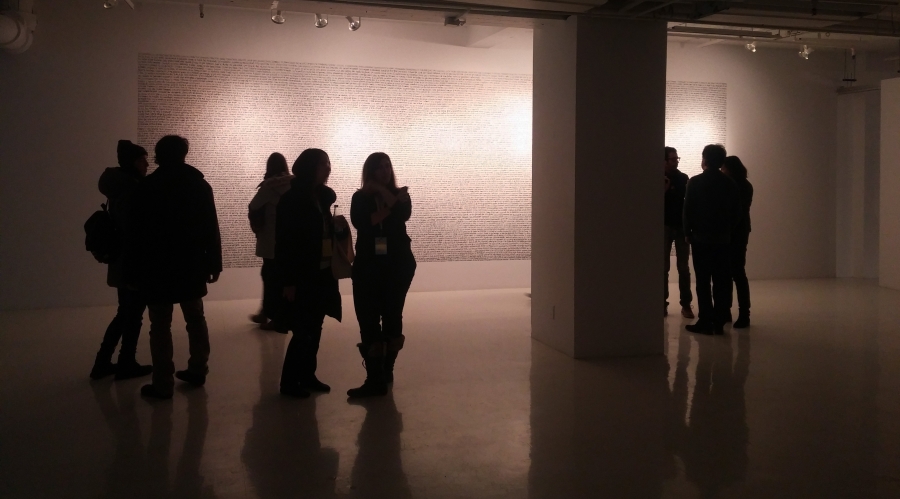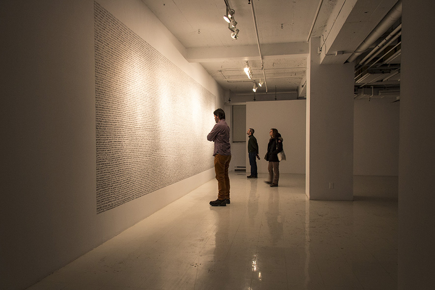 Jean-Christophe Norman nous propose tout d’abord une action dans l’espace encore intact de la galerie, une marche, à laquelle il s’astreint durant un jour et une nuit et dont on conservera les traces. L’action laisse bientôt place à l’élaboration d’un espace immersif. Sur les murs de la Galerie des arts visuels, l’artiste retranscrit, inlassablement, divers textes : les siens, mais aussi les mots des autres, recueillis au fil de ses errances: « Les paroles s’enchaînent, […] émettent des souhaits, des plaintes, diverses réflexions sur la vie de tous les jours, la façon dont le monde avance, la façon dont le monde s’invente » (Jean-Christophe Norman).