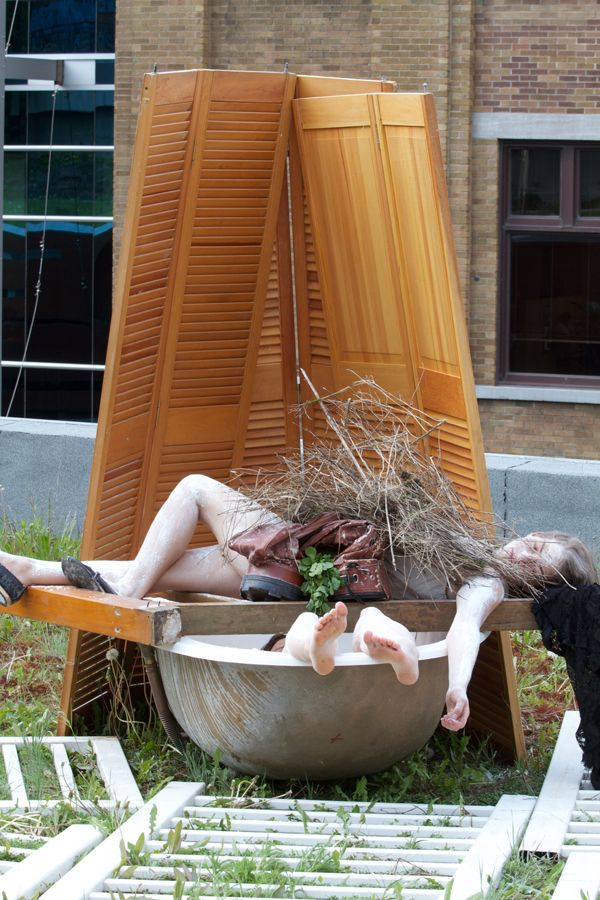 De la résistance nous propose en continu l’action de performeurs en différentes séances programmées. L’espace du toit se verra transformé en mosaïque humaine en perpétuelle mutation. Les corps, à la fois architecturés et chorégraphiés génèreront des images poétiques issues du langage plastique et iconographique de Marie-Claude Gendron et de Rossana Lanzani. De la résistance saura joindre les pratiques respectives des artistes en performance et en fabrication d’objets prothèses. Le citadin pourra assister à la lente transformation de l’espace par les performeurs tout au long de ces trois jours.
