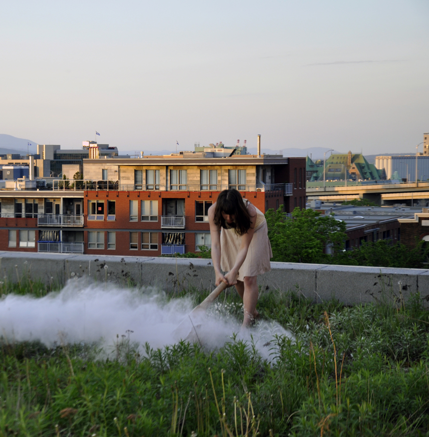 Vernissage: Évènement performatif de longue durée : Toit de l’édifice La Falaise apprivoisée, 325, De St-Vallier Est. Actions visibles de l’escalier du Faubourg et de la rue St-Réal.